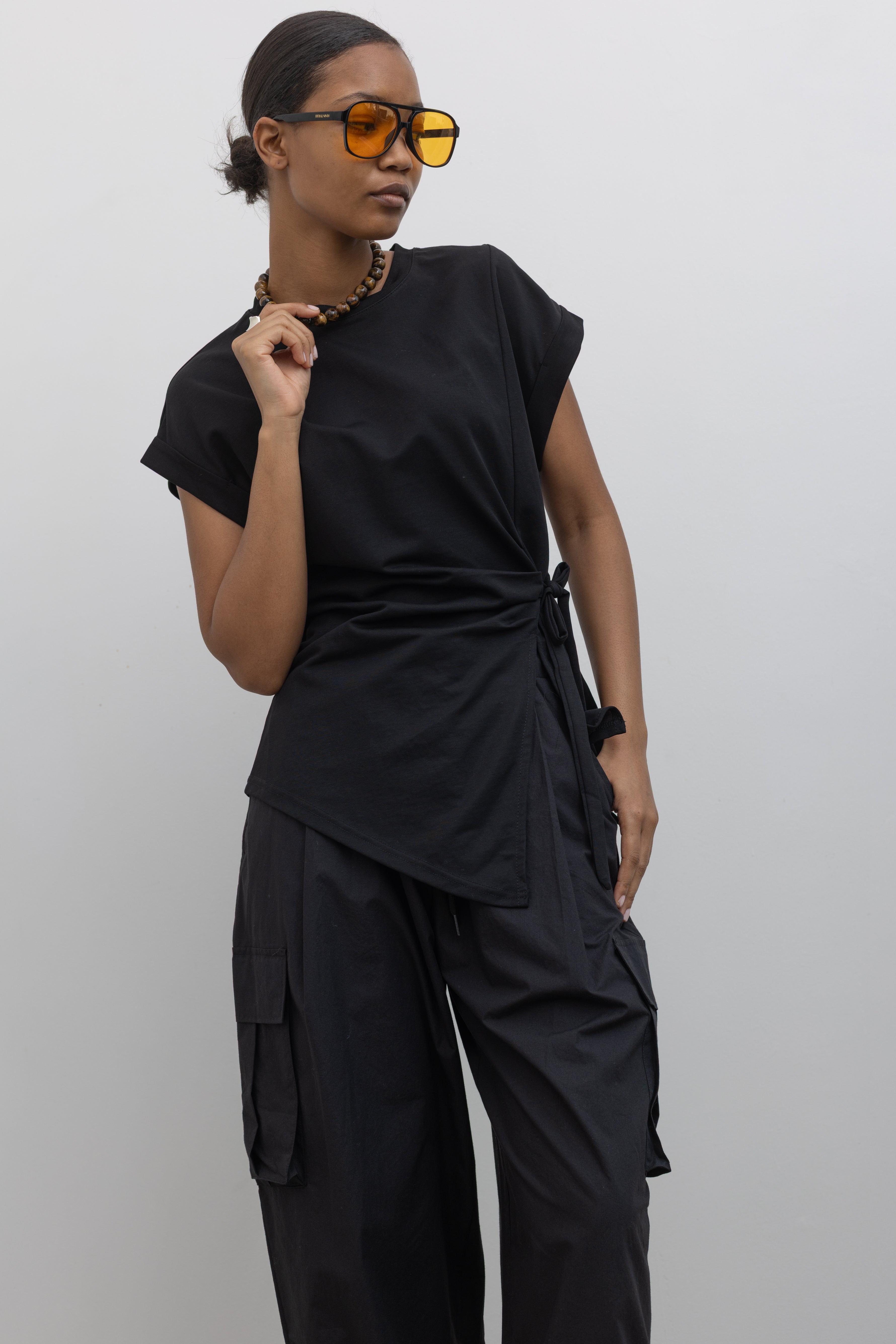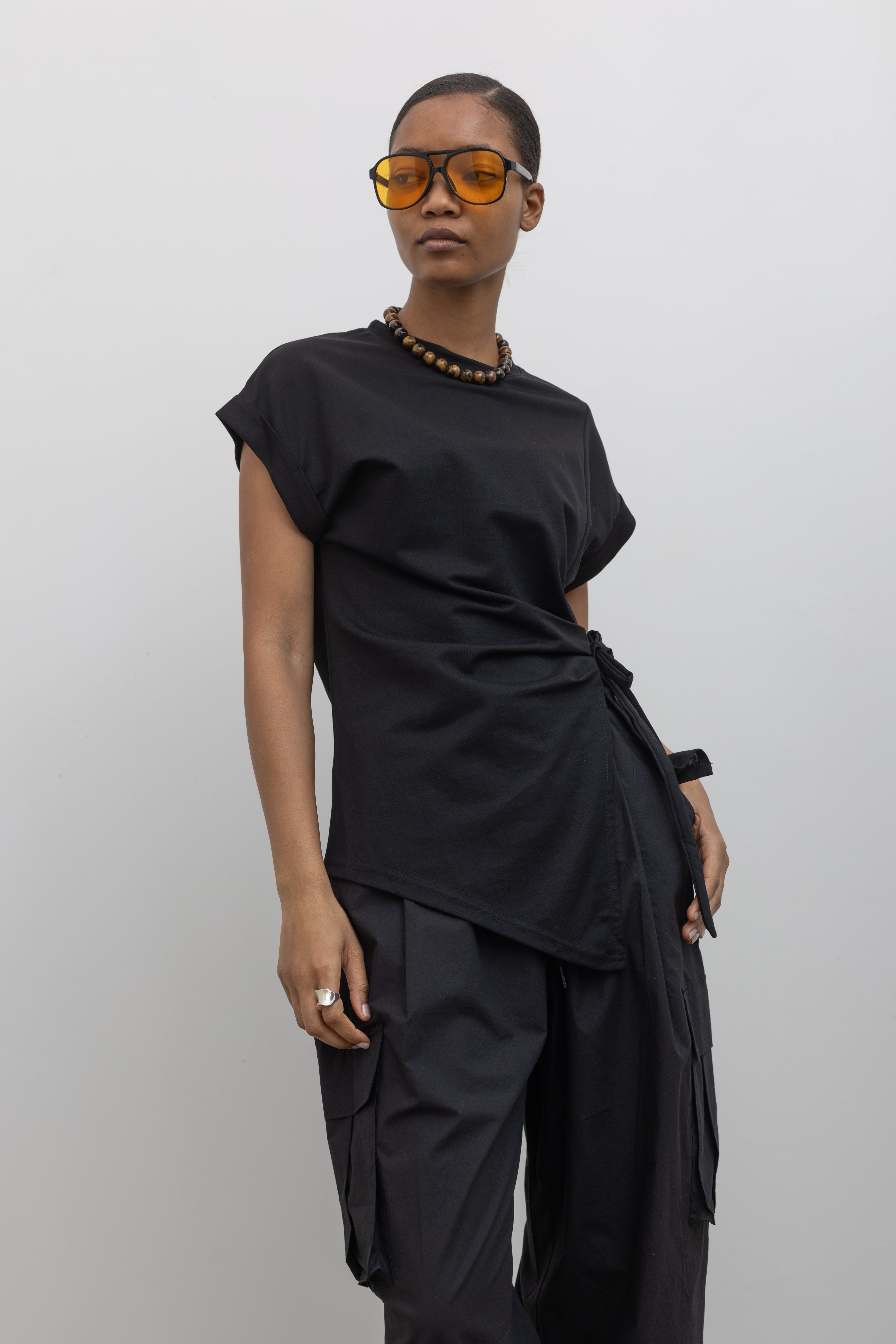 Black Drop Shoulder Ribbon Tie Top