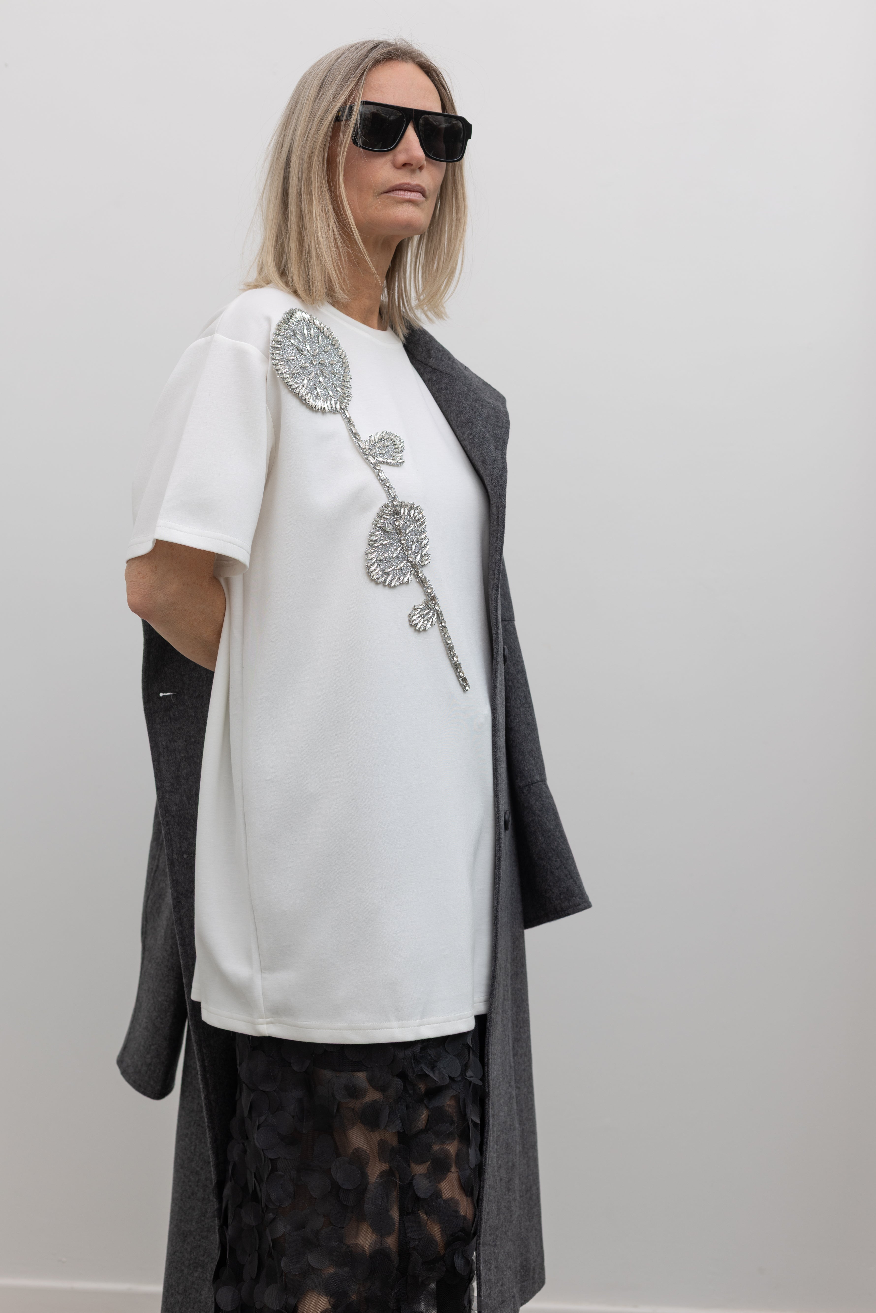 White Beaded Flower Embellished Long Top